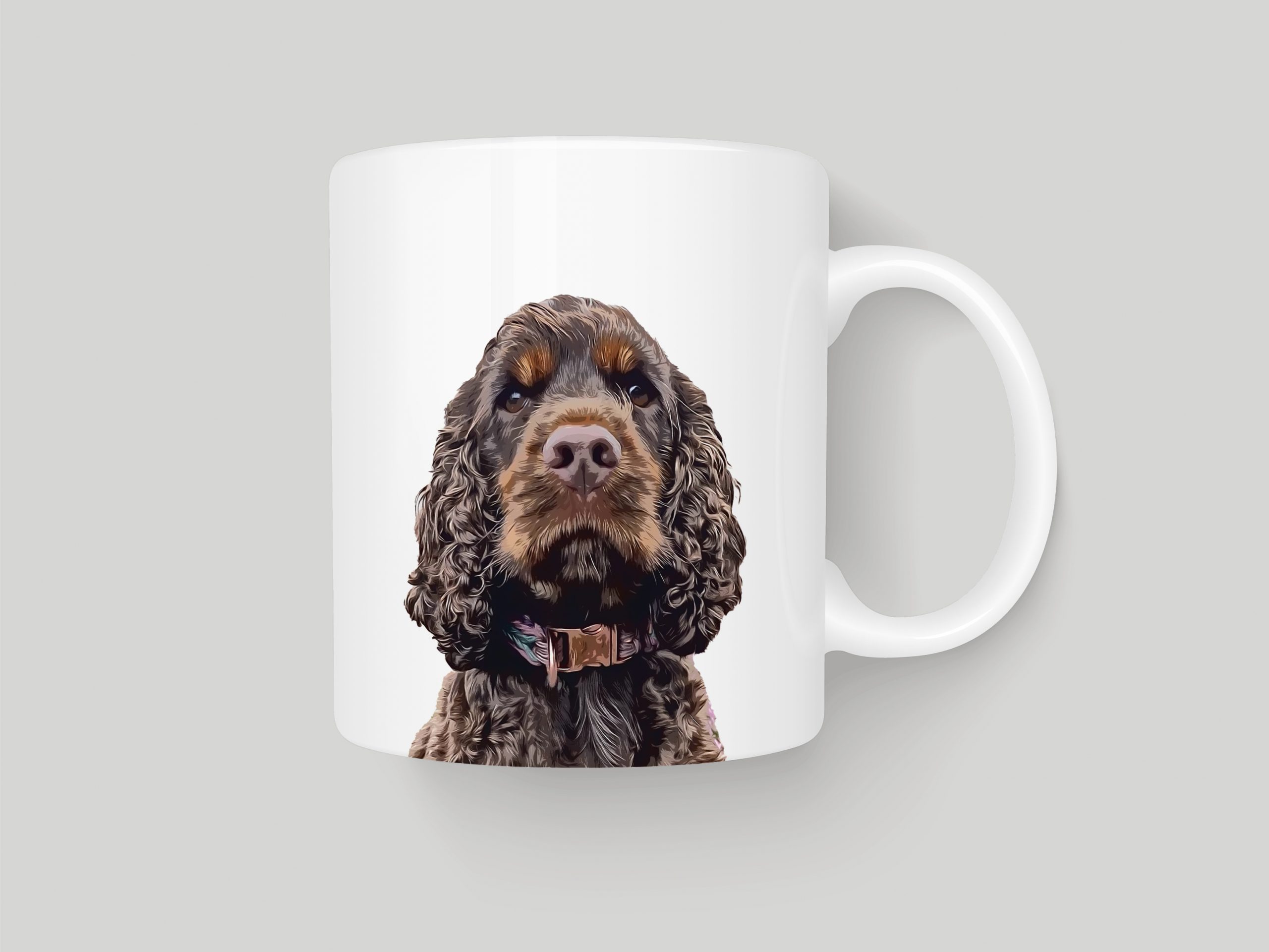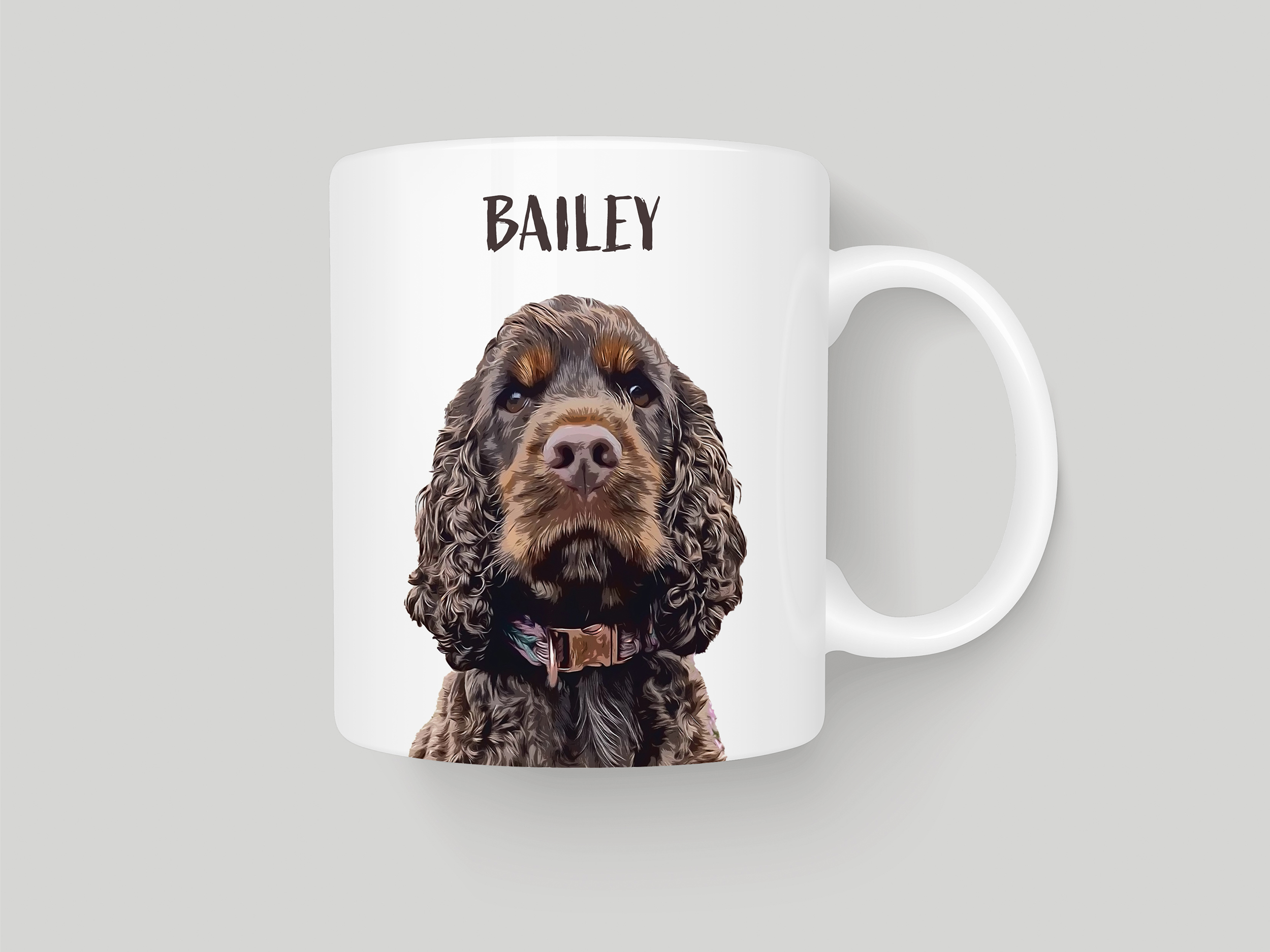 Turn your favourite dog photos into a beautiful modern mug. We digitally create a portrait from your photo in the modern style to print onto the mug. The portrait will be printed on both sides of the mug, and can also include a name (optional).